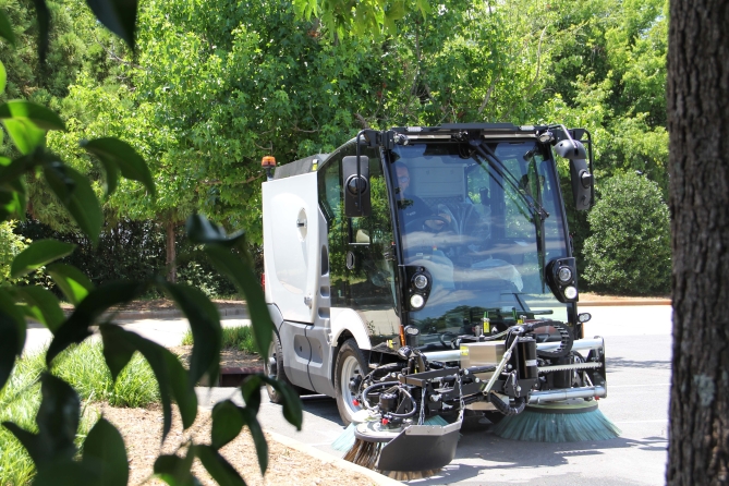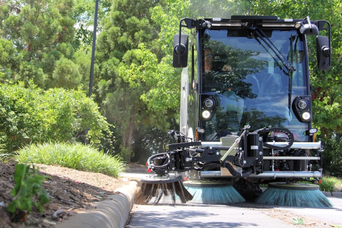 Agile in the city. A short overhang and selectable 2 and 4 wheel steering, with a patented auto-steer system, helps the operator sweep in tight spaces. This system also makes the transition from sweeping to transit easy.