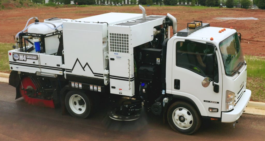 This is the NON CDL baby brother to the M6. This mechanical broom sweeper has 4 cubic yard capacity ,can dump into any dump truck at variable heights up to 10’, and has 42” dia side brooms. This compact unit is mounted on an Isuzu cab over chassis with diesel engine and auto trans.