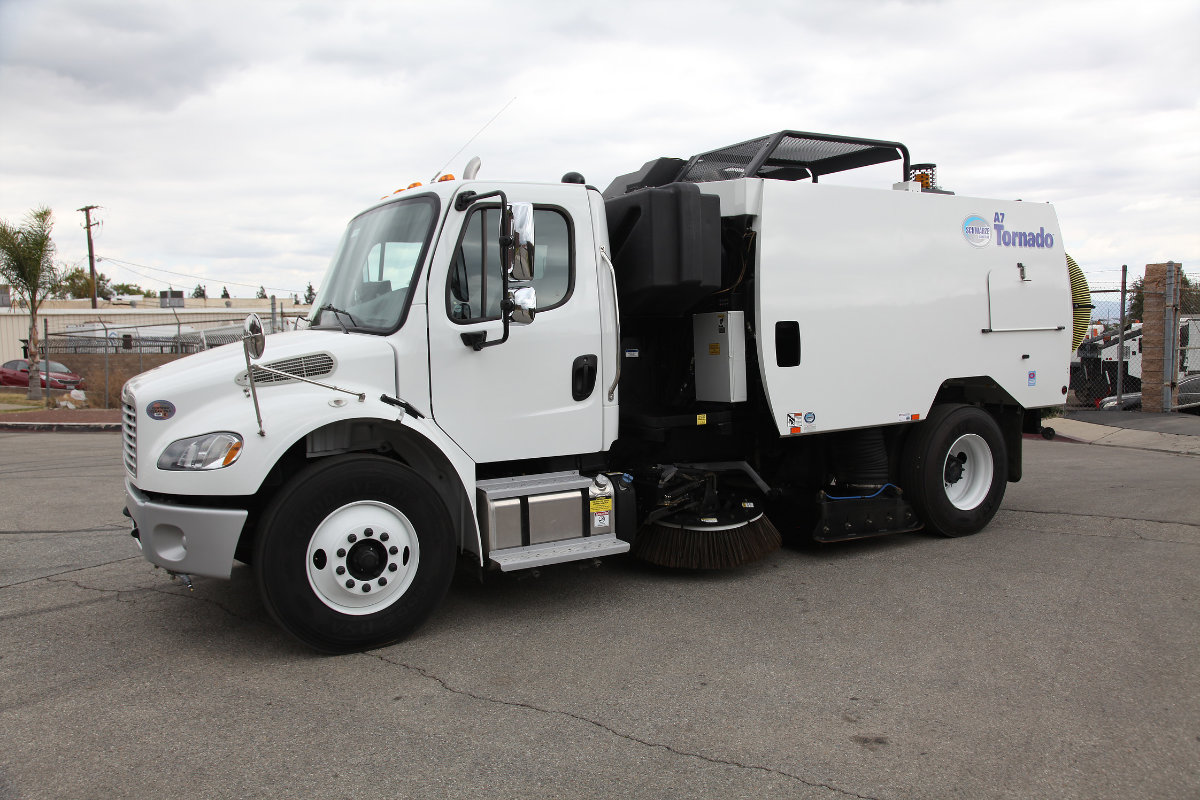 The Schwarze® A7 Tornado™ is a heavy-duty, chassis mounted, regenerative air street sweeper with an 8.4 cubic yard hopper. The A7 Tornado™ has over 20 years of successful operation throughout the United States and around the world. The A7 Tornado is the most popular street sweeper in the Schwarze lineup. With it’s standard high flow saw tooth screens, high efficiency whisper wheel blower and proven blast orifice pickup head, the Schwarze A7 tornado is the standard of the sweeping industry.